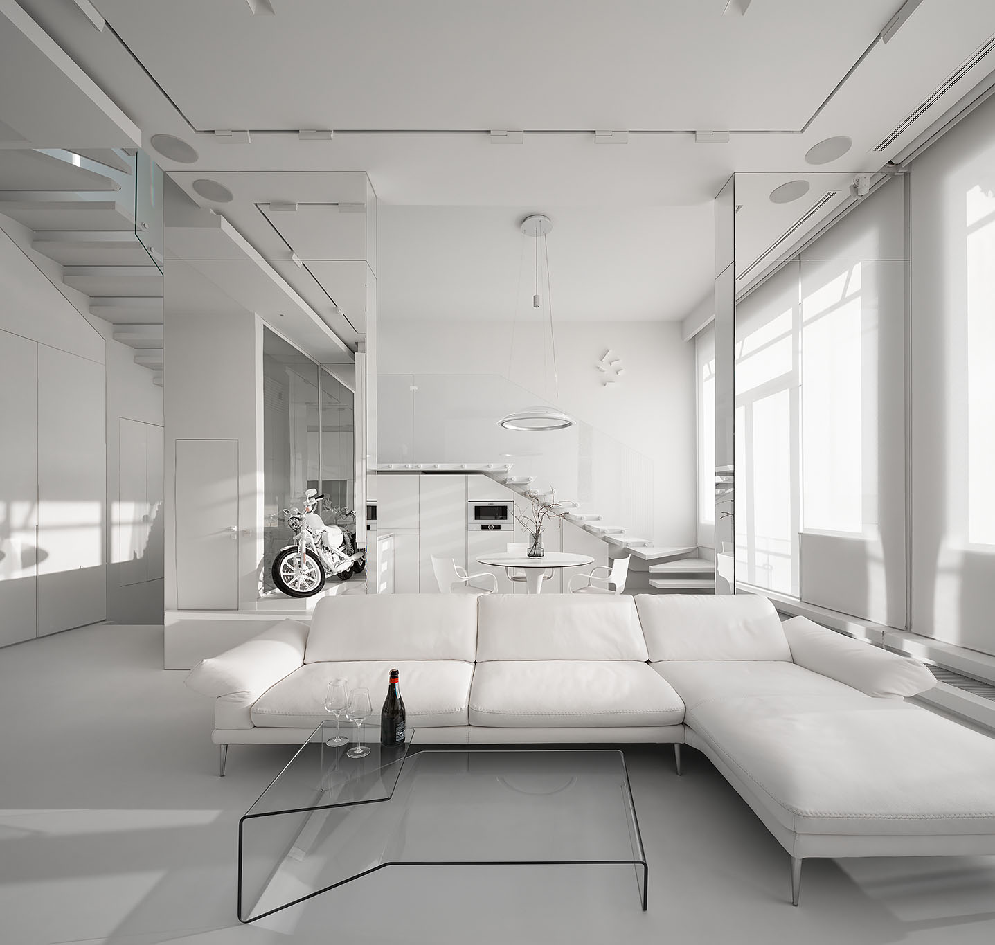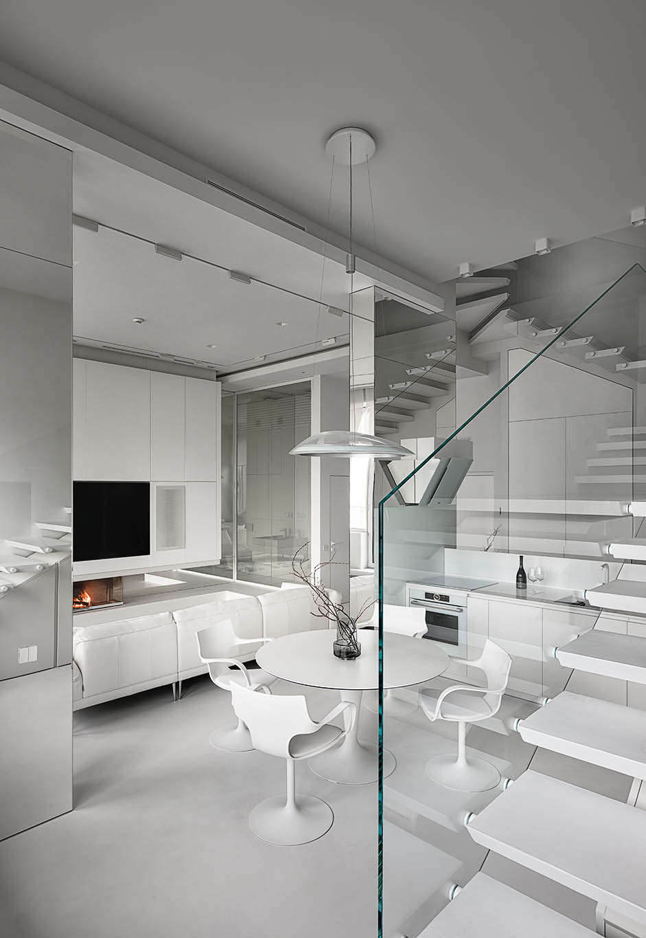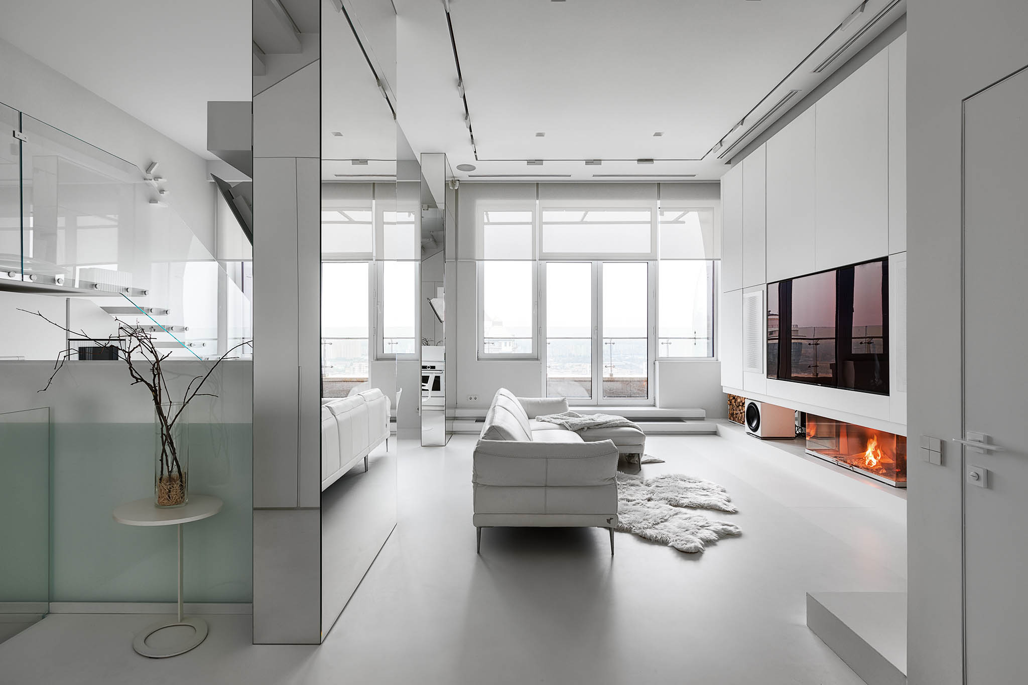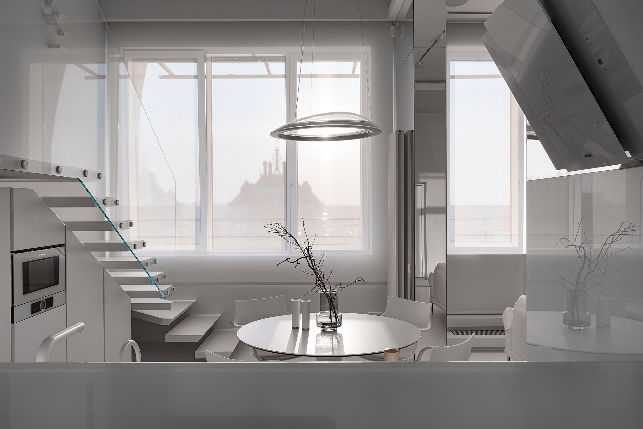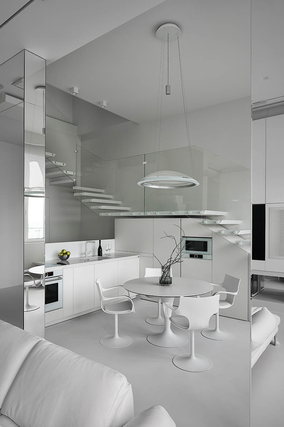 Цей пентхаус створює ультрасучасний мінімалізм і розкіш, створюючи простір, що забезпечує комфорт та стильне самовираження. Інтер’єр вирізняється білосніжною кольоровою гамою, що підкреслює чистоту та відкритість простору, а дзеркальні та скляні поверхні відбивають світло, додаючи приміщенню глибини та простору.