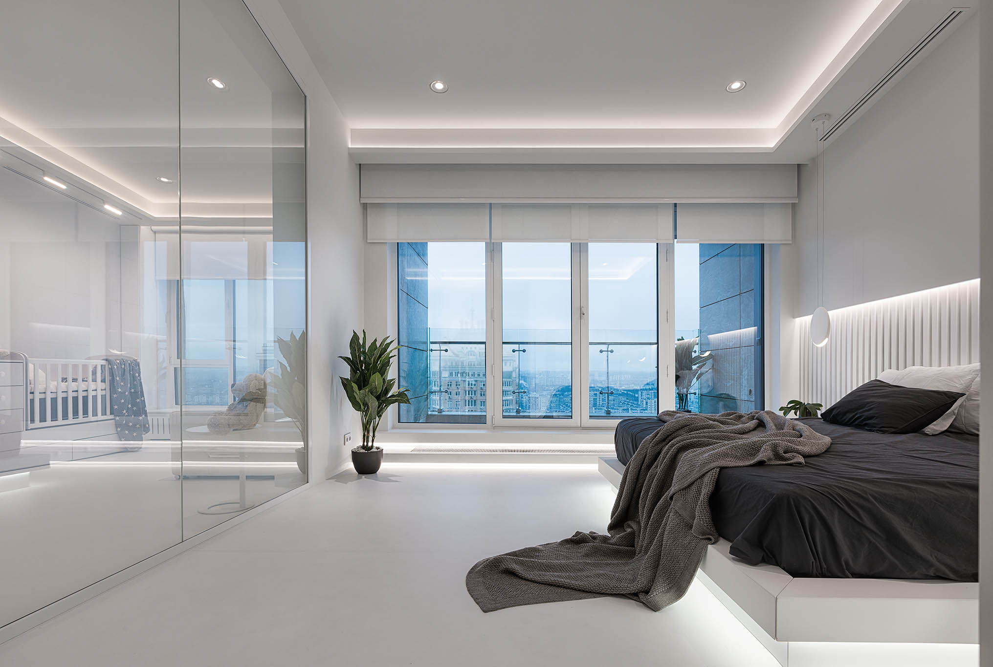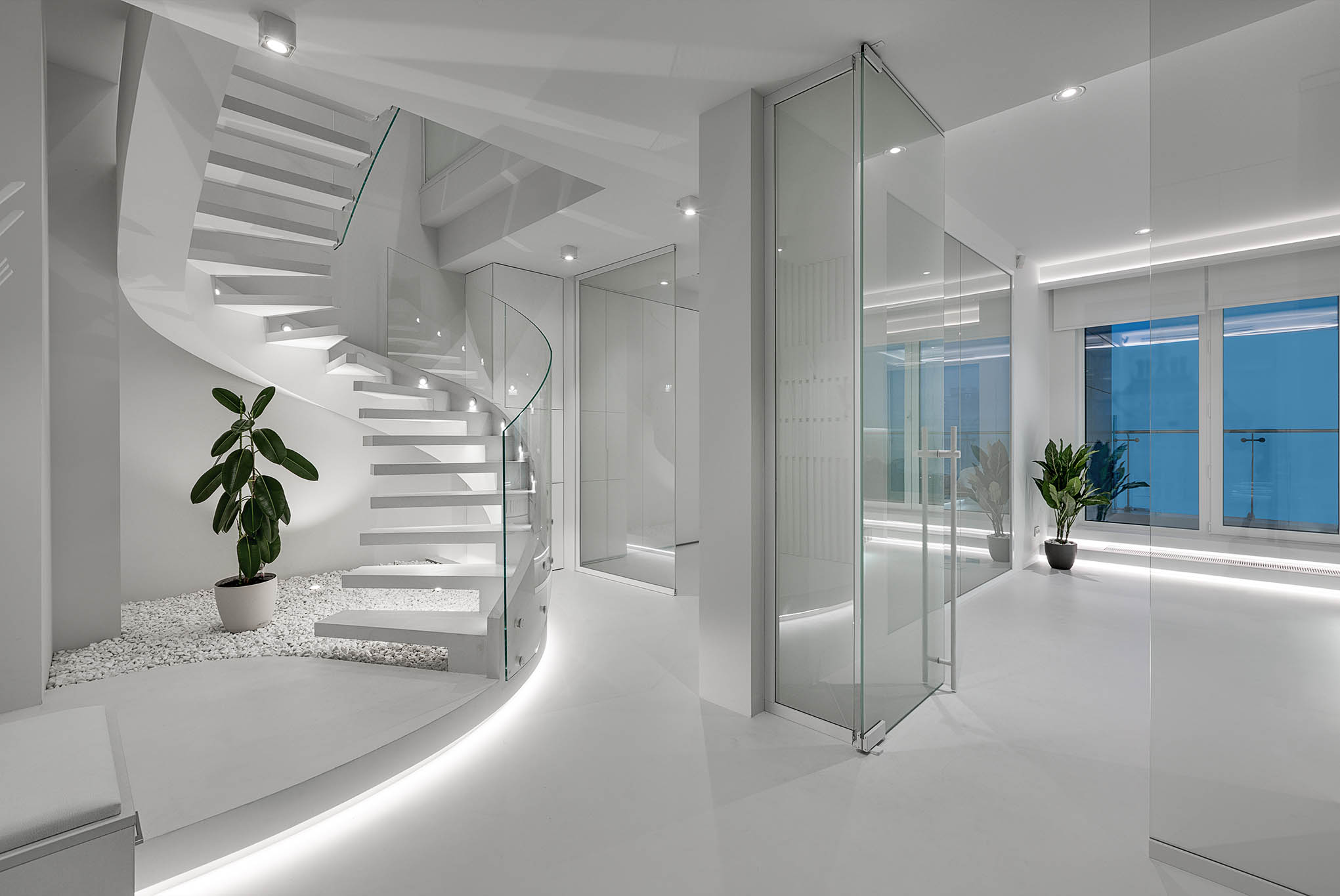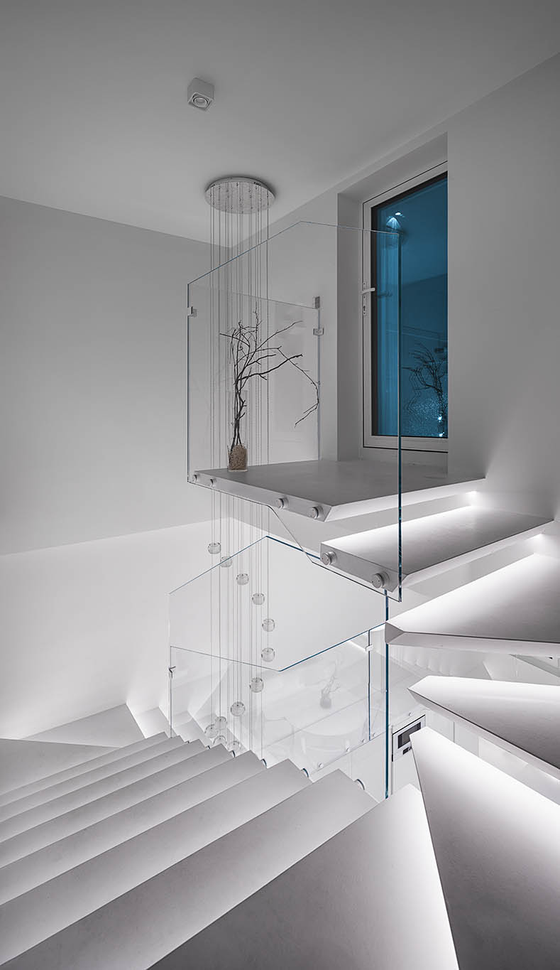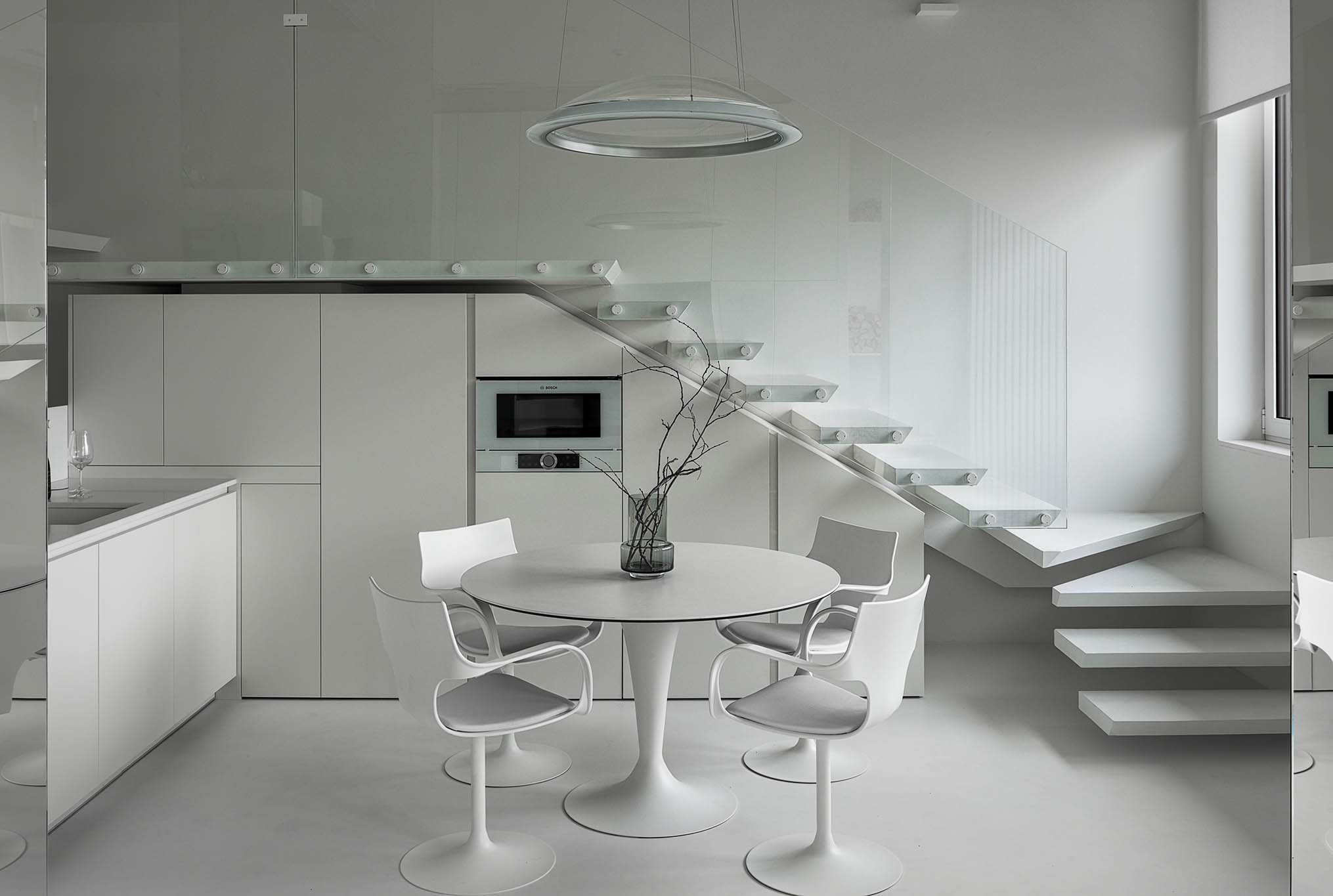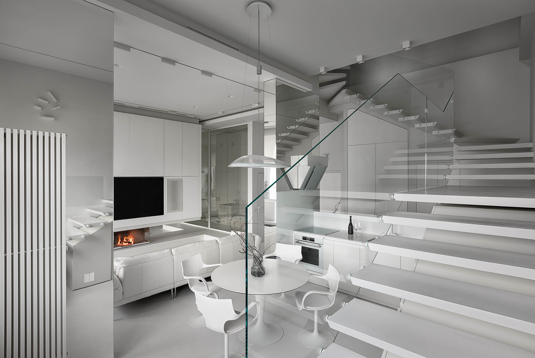 Цей пентхаус створює ультрасучасний мінімалізм і розкіш, створюючи простір, що забезпечує комфорт та стильне самовираження. Інтер’єр вирізняється білосніжною кольоровою гамою, що підкреслює чистоту та відкритість простору, а дзеркальні та скляні поверхні відбивають світло, додаючи приміщенню глибини та простору.