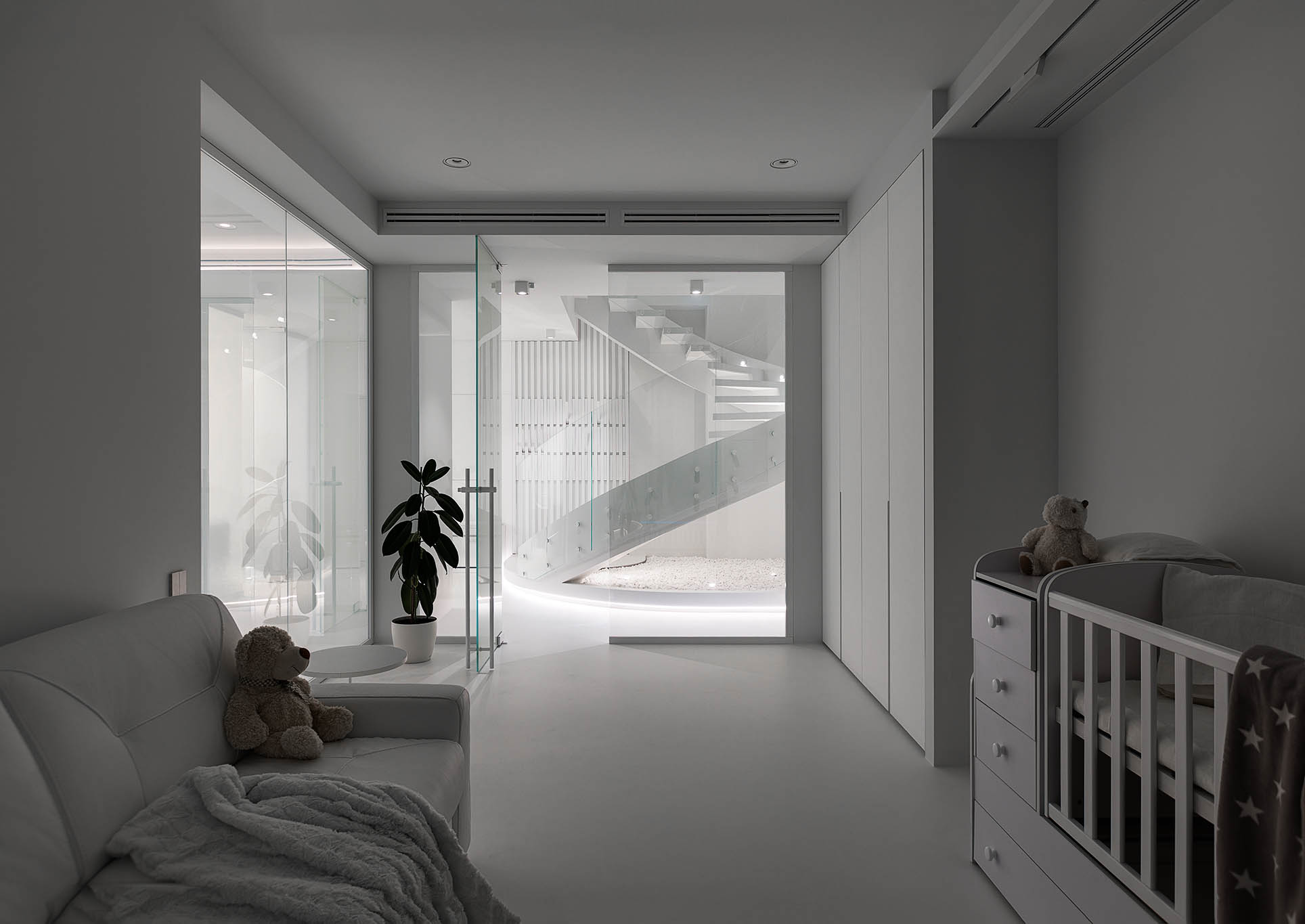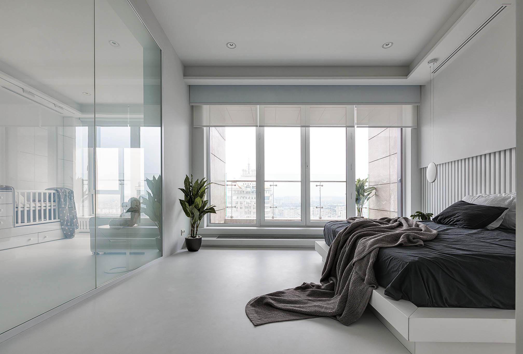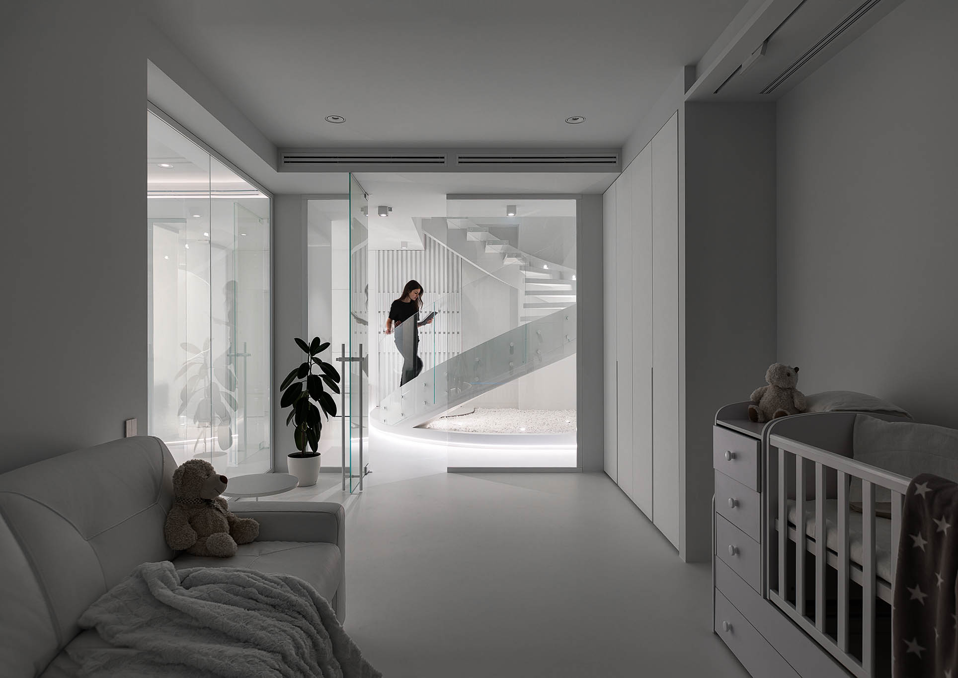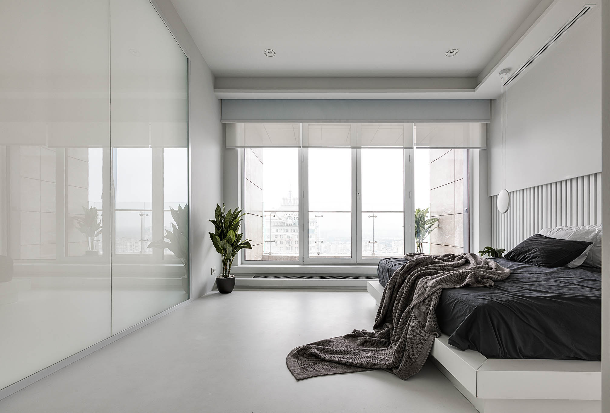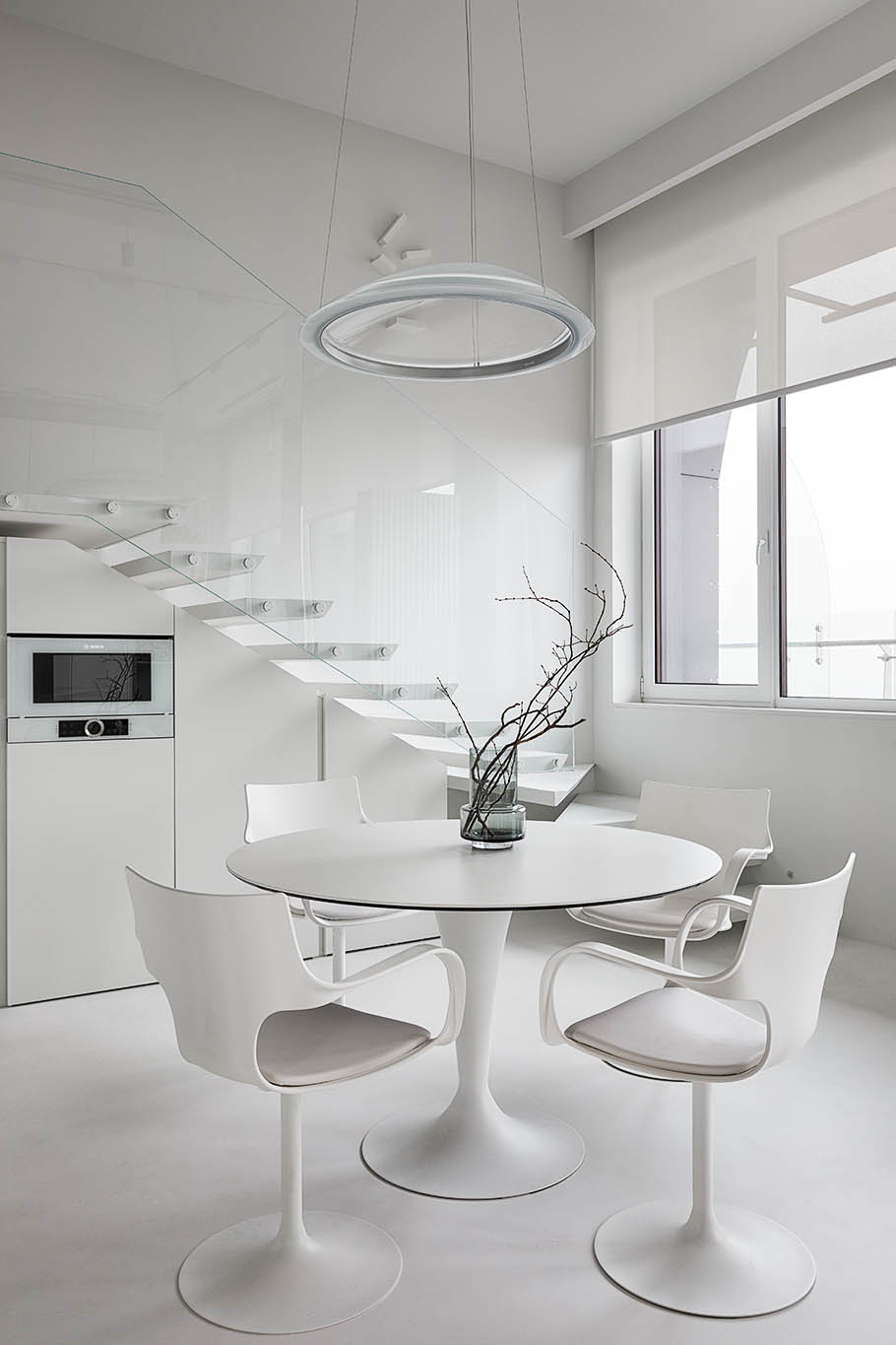 Цей пентхаус створює ультрасучасний мінімалізм і розкіш, створюючи простір, що забезпечує комфорт та стильне самовираження. Інтер’єр вирізняється білосніжною кольоровою гамою, що підкреслює чистоту та відкритість простору, а дзеркальні та скляні поверхні відбивають світло, додаючи приміщенню глибини та простору.