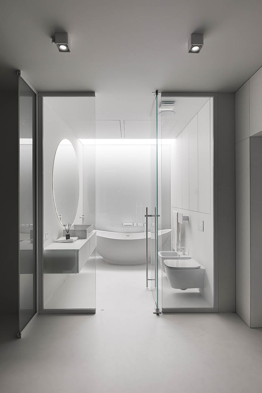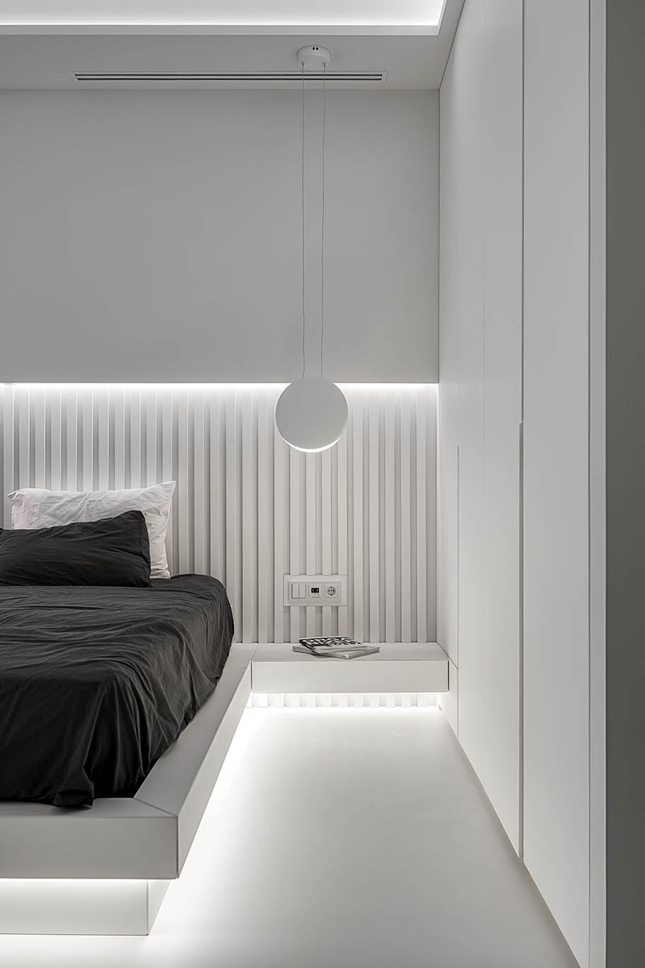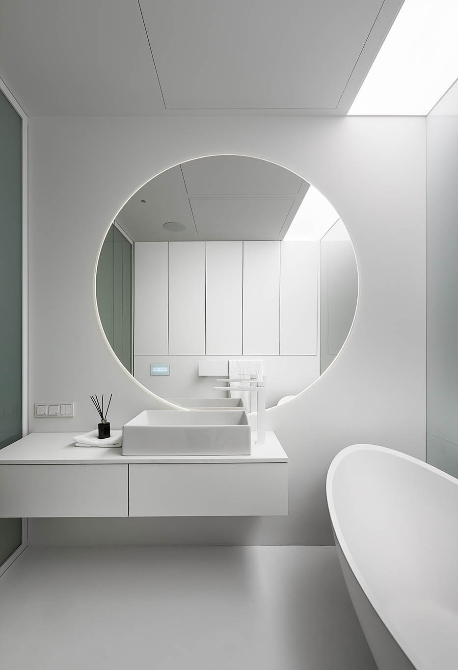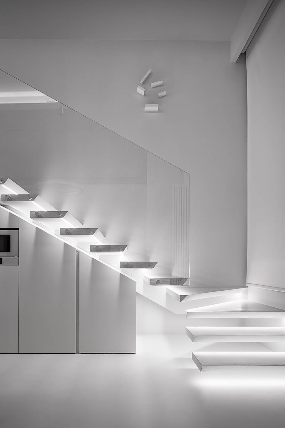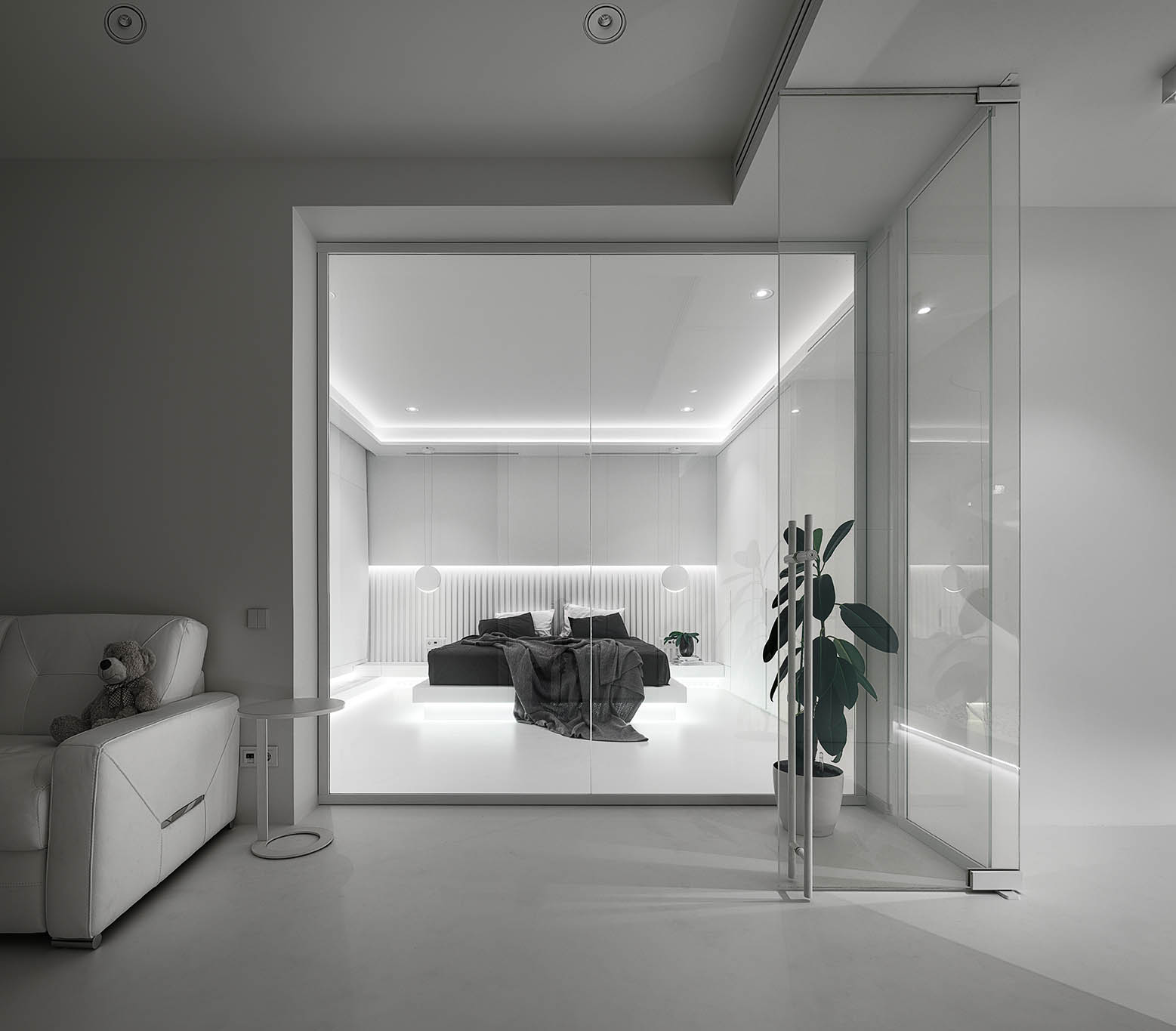 Цей пентхаус створює ультрасучасний мінімалізм і розкіш, створюючи простір, що забезпечує комфорт та стильне самовираження. Інтер’єр вирізняється білосніжною кольоровою гамою, що підкреслює чистоту та відкритість простору, а дзеркальні та скляні поверхні відбивають світло, додаючи приміщенню глибини та простору.