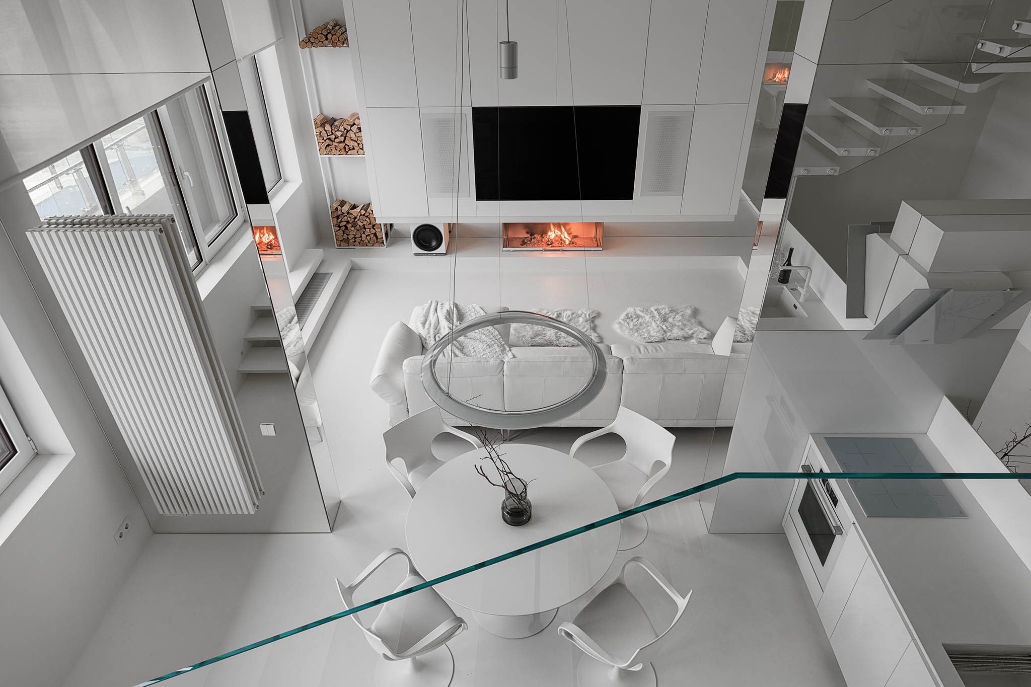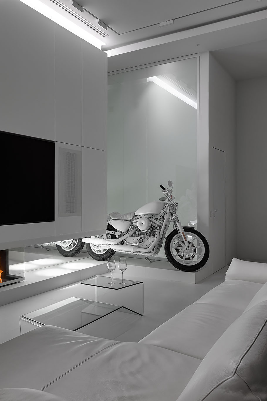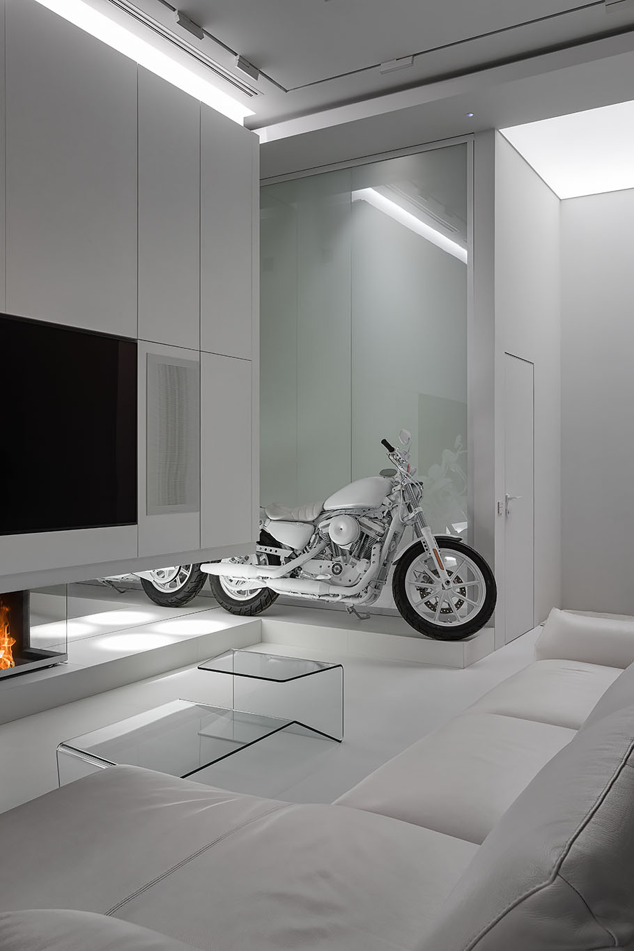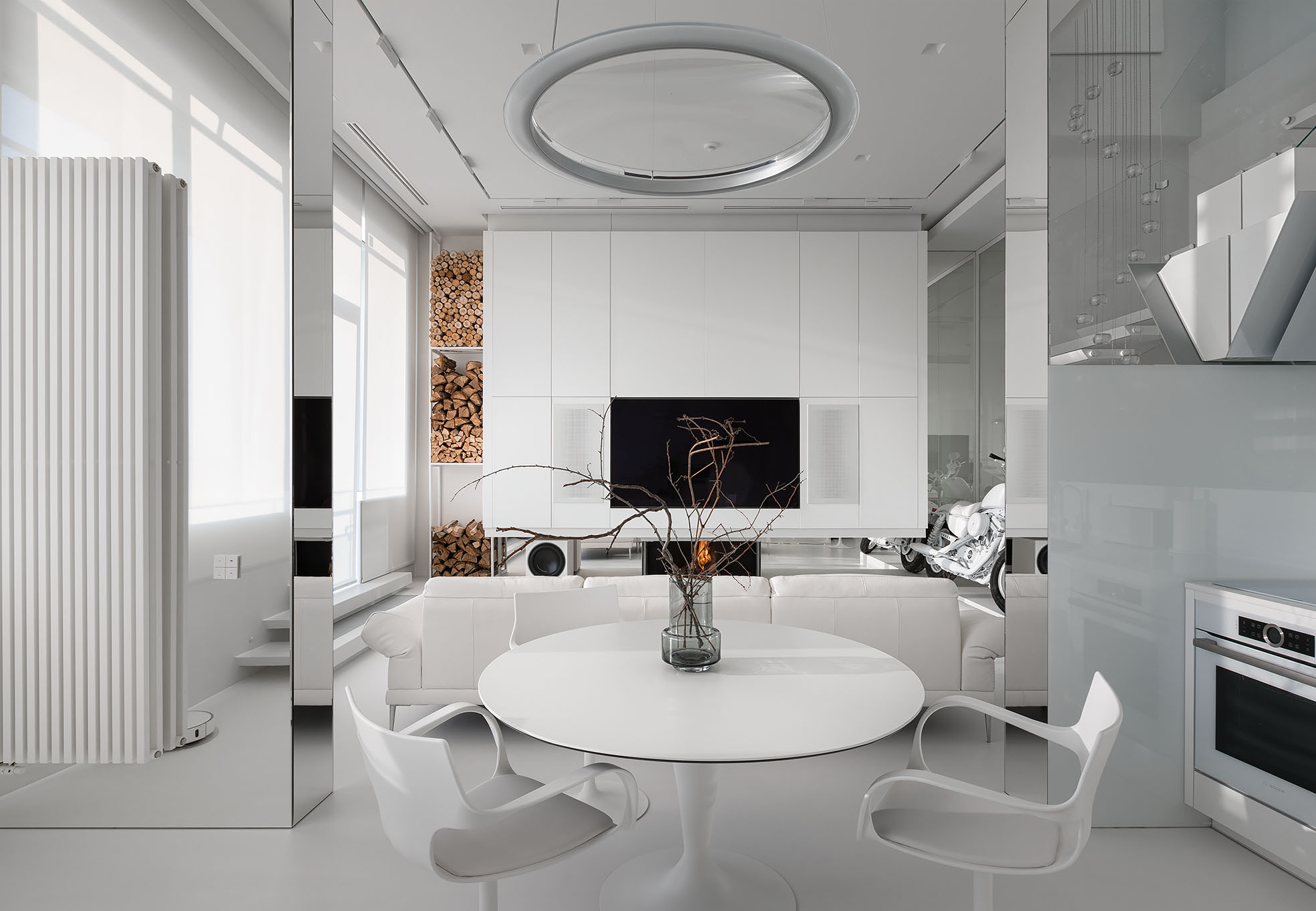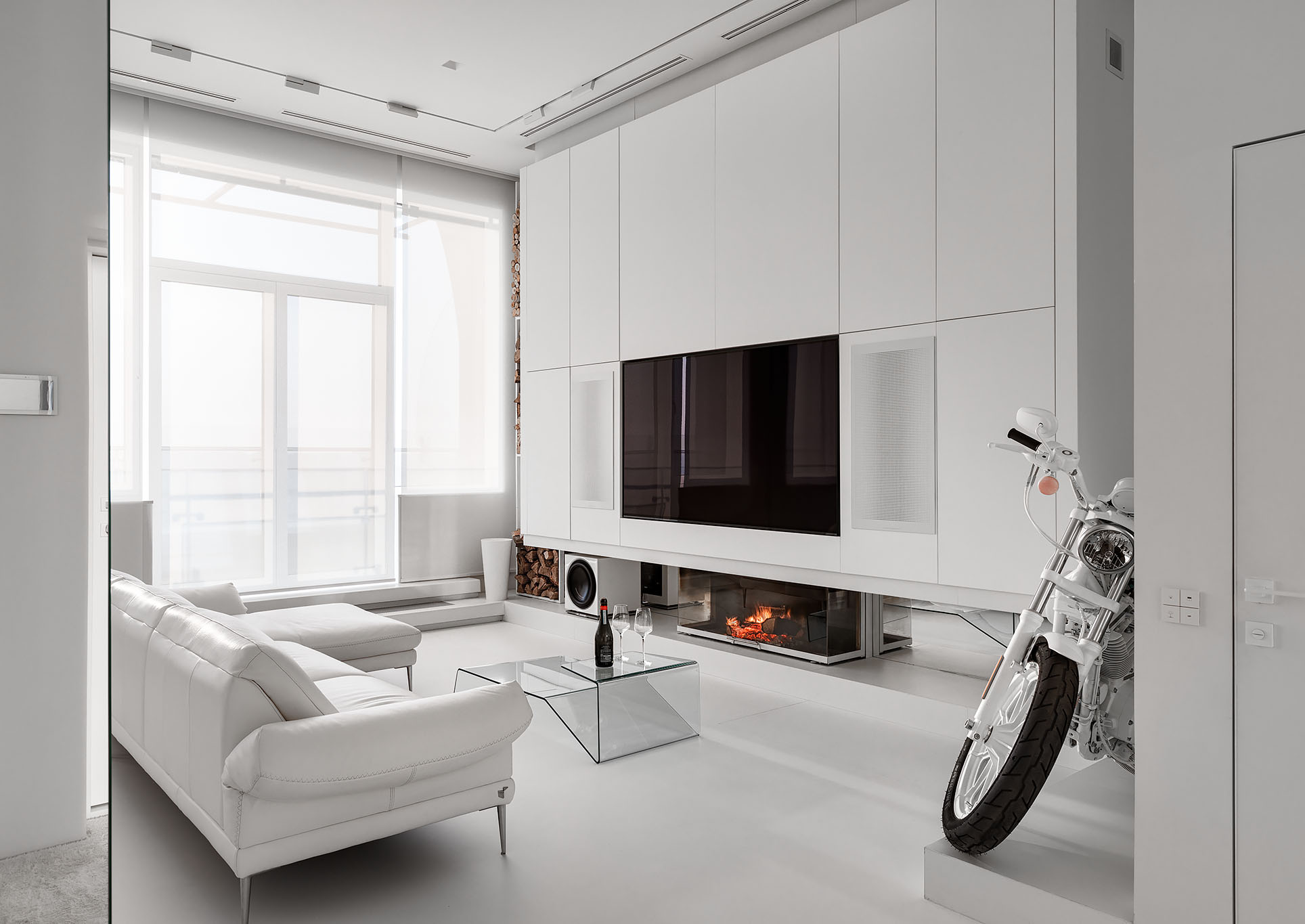 Головний акцент інтер’єру — унікальні деталі, як-от білий мотоцикл, що надають характеру і створюють арт-акцент у всій хвилині. Сучасний камін у лаконічному стилі й прозорі меблі підтримує загальну концепцію мінімалізму. Кухня та обідня зона з плавними лініями меблів органічно інтегровані в загальний простір, підкреслюючи функціональність без зайвих деталей.