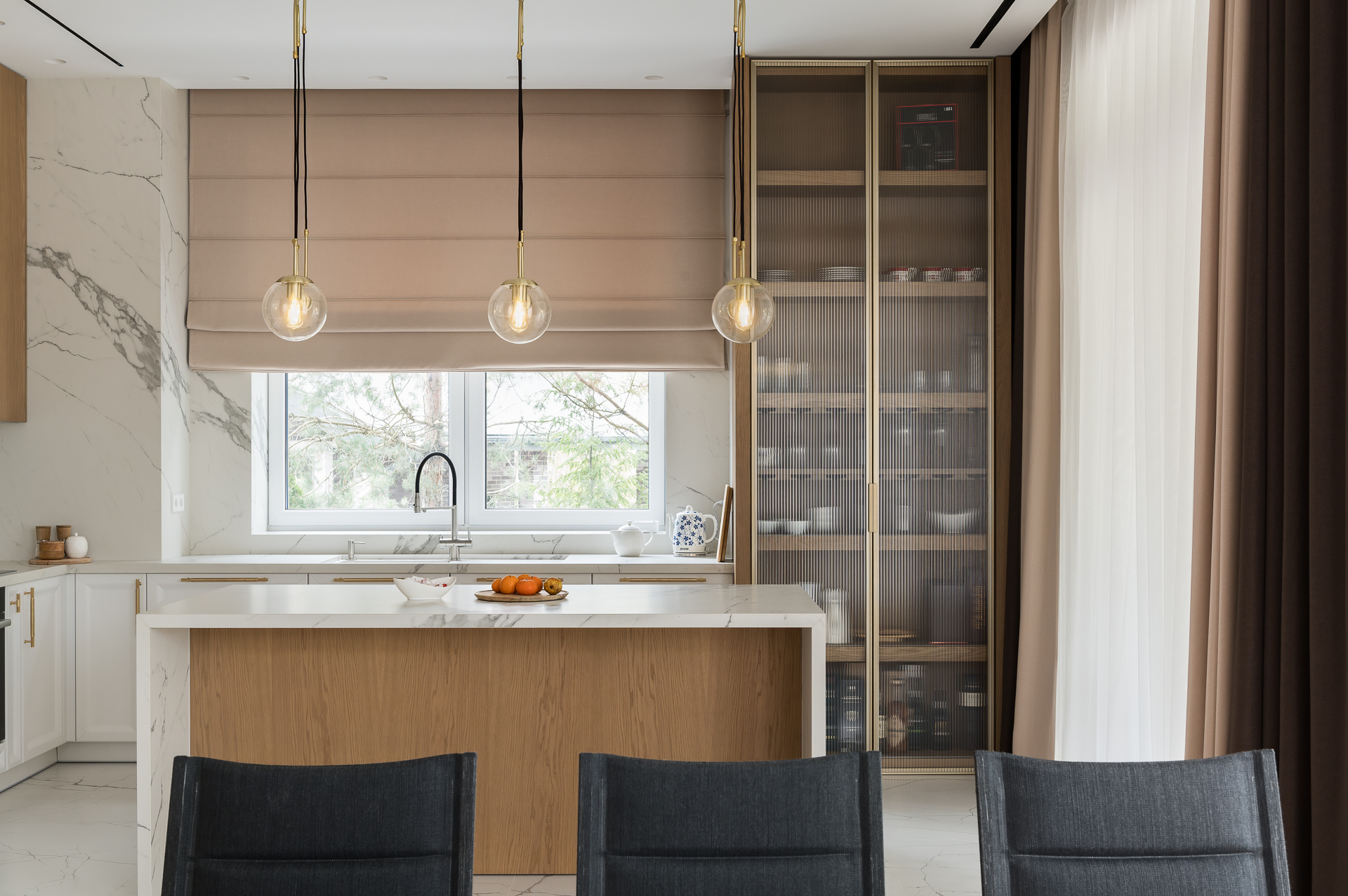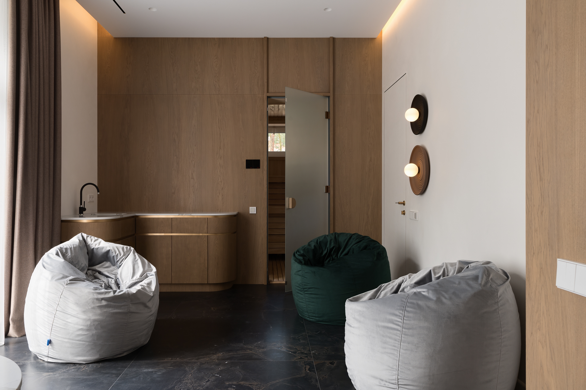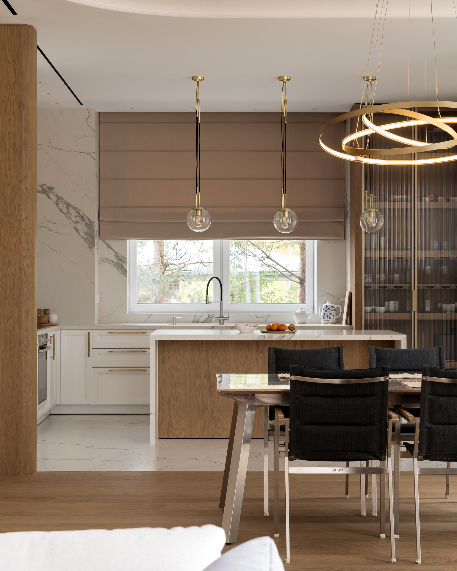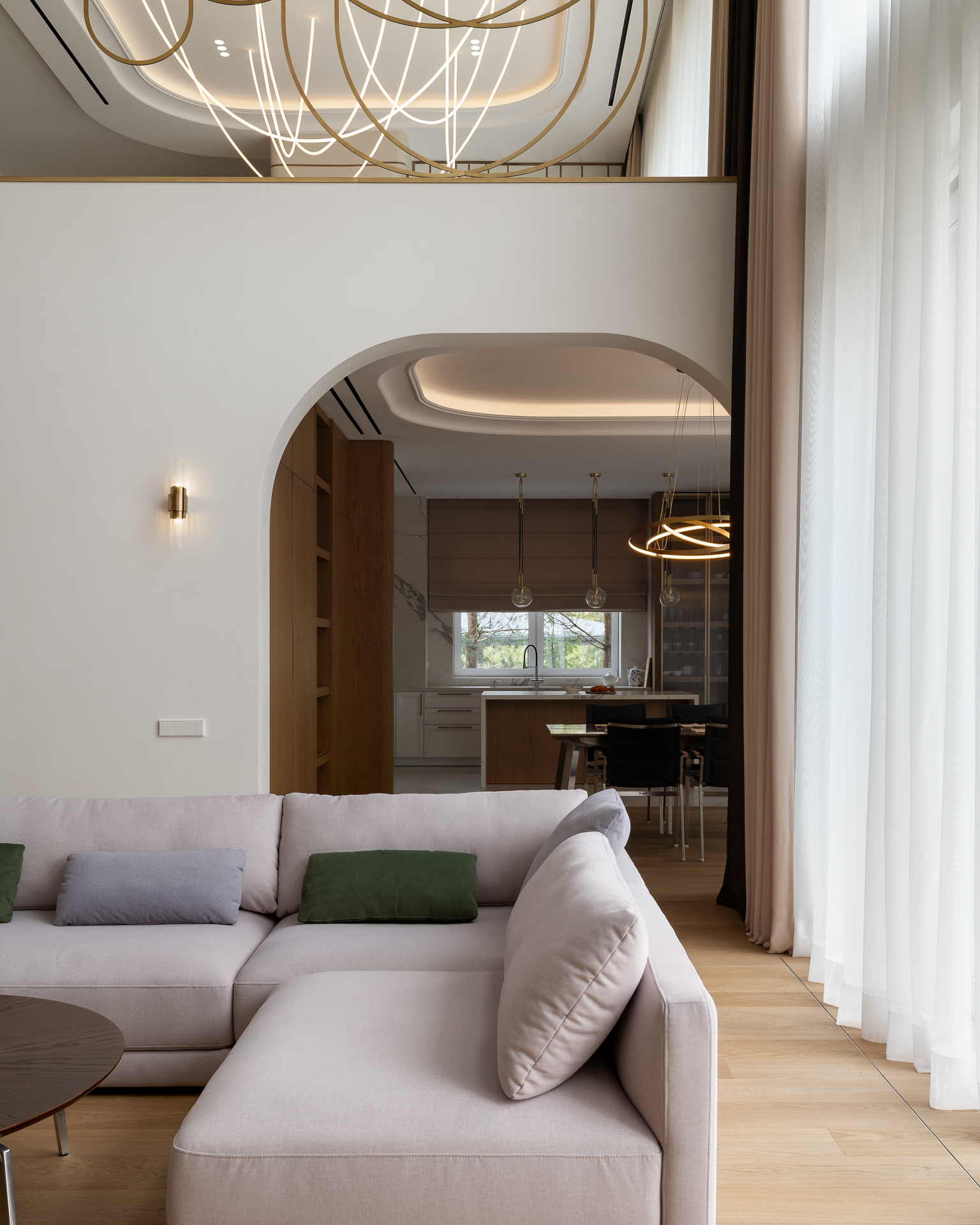 Інтер’єр втілює баланс між сучасною простотою та елегантністю, використовуючи натуральні матеріали та приглушені відтінки для створення гармонійної атмосфери, де кожен елемент створює вишуканість і комфорт.
